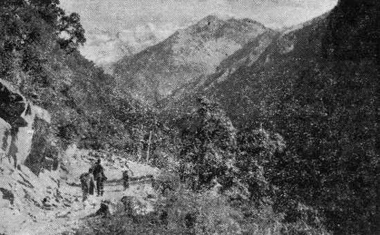 கௌரிகுண்டத்திலிருந்து கேதார்நாத் செல்லும் பாதை அத்தனை இலகுவான பாதை என்று நீங்கள் நினைத்துக் கொள்ள வேண்டாம். 14 கிலோ மீட்டர் தூரமுள்ள அந்தப் பாதை ஆரம்ப முதல் முடிவு வரை ஒரே ஏற்றம்தான். கொஞ்ச தூரம் வரை சமதரை என்ற பேச்சுக்கே அங்கு இடம் கிடையாது. ஒவ்வொரு மைல் ஏற்றத்திற்கும் ஒரு முழுமையான ஆயிரம் அடிகள் உயரம் கூடிக்கொண்டே இருக்கின்றது. கேதார்நாத்தை எட்டிப் பிடிக்கும்போது 11,750 அடிகள் ஆகிவிடுகின்றது. உயரம் போகப் போக பிராண வாயு சற்று குறைவுபடுவதால் நாம் சுவாசிப்பது சற்று கடினமாக உள்ளது. எங்கள் வலது கைப்பக்கத்தில் அதல பாதாளம் உள்ளது. சற்று ஏமாந்தால் போதும் நமது ஜீவனற்ற சடலத்தைக்கூட மேலே கொண்டு வர இயலாது. அந்தக் கெடு பாதாளத்தில் மந்தாகினி நதி ஓடிக் கொண்டிருக்கின்றது. இந்த மந்தாகினி நதி கங்கை நதியின் ஒரு உப நதியாகும். வலது கைப்பக்கம் வானளாவிய இமயமலைத் தொடர் உள்ளது. அதின் அடர்ந்த காடுகளில் இமயத்தின் நானாவித பறவைகளின் சத்தமும், வண்டுகளின் ரீங்காரமும் விட்டு விட்டுக் கேட்டுக் கொண்டே இருக்கின்றது. நாங்கள் சென்ற பயணப்பாதை எப்படிப்பட்டது என்பதை ஒரு படம் உங்களுக்குத் தெளிவுபடுத்தும். மூன்று யாத்ரீகர்கள் செல்லுகின்றனர். தொலைவில் வெண்பனி சிகரத்தை நீங்கள் காணலாம்.
