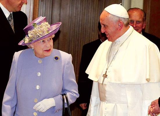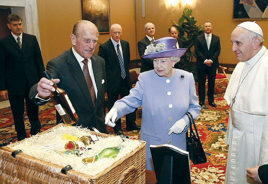 இப்படிப்பட்ட பரிசுத்த மகாராணியின் குடும்பத்தில் பிறந்த தற்போதைய இங்கிலாந்து தேச மகாராணி எலிசபெத் அம்மையார் அவர்கள் 6/4/2014 ஆம் தேதி ரோமாபுரியிலுள்ள போப் ஆண்டவர் பிரான்சிஸ் அவர்களை சந்திக்கச் சென்றபோது அவருக்கு இங்கிலாந்திலிருந்து அன்பளிப்பாக என்ன கொண்டு சென்றிப்பார்கள் என்று நீங்கள் நினைக்கின்றீர்கள்? உண்மையாகவே தங்க முலாம் பூசப்பட்ட ஒரு அழகான வேதாகமத்தைத்தான் அவர்கள் எடுத்துச் சென்றிருப்பார்கள் என்று நாம் திட்டமாக நினைப்போம். அப்படி அவர்கள் செய்திருப்பார்களானால் கர்த்தருடைய நாமம் எத்தனையாக பரிமளித்திருக்கும்! ஆனால், அவர்கள் அதைச் செய்யவில்லை. அதற்கு மாறாக விலையுயர்ந்த மதுபான (Whisky) பாட்டல்களை கூடையில் வைத்து எடுத்துக்கொண்டு சென்று அவருக்கு கொடுத்தார்கள். கூடையில் மதுபாட்டல்கள் இருப்பதையும், ஒரு மது பாட்டலை அம்மையாரின் கணவர் இளவரசர் பிலிப் அவர்கள் தனது கரத்தில் ஏந்தியவராக அதின் சிறப்பை போப் ஆண்டவரிடம் கூறுவதைப்போல நமக்குத் தெரிகின்றது. எத்தனை துயரமான காரியம் பாருங்கள்! ராணியார், போப் ஆண்டவருடன் பேசுவதையும், அன்பளிப்பாக வழங்கப்பட்ட மதுப்பாட்டல்கள் உள்ள அழகான மூங்கில் கூடையையும் படத்தில் நீங்கள் காணலாம்.